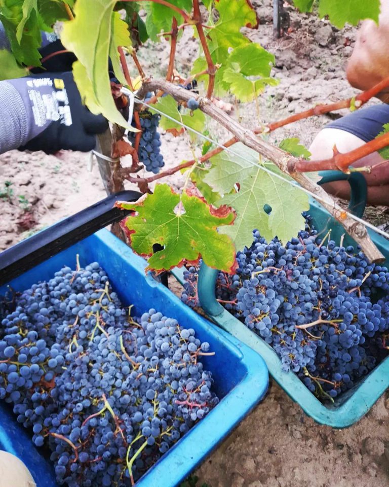 A date de maturité optimale, les vendanges manuelles sont effectuées avec un tri attentif au moment de la cueillette. Le raisin est trié et séparé de sa rafle (l’égrappage). Dans un même temps on assiste à l’éclatement des baies et la libération du jus.